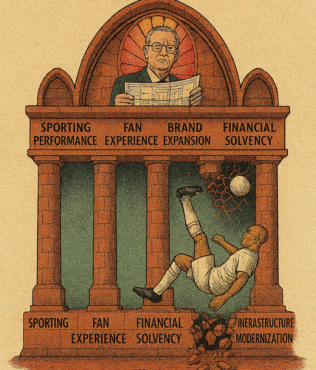 This is a classic tipping point problem: how do you take something inherently irrational (sports fandom) and systematize it without killing what made it magic in the first place? The mission was audacious: become the team of the 21st century. Not just through trophies, but through solvency, spectacle, and global resonance.